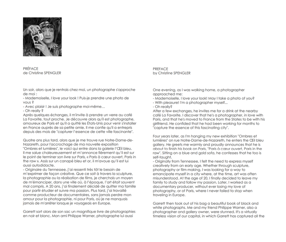Garrett Strang is an American photographer who has lived in France for ten years and is fascinated by the appropriation of Parisian public space by a variety of people at the heart of a cultural kaleidoscope. His images are taken on the spot, without calculation, raw and blatantly true, “in the raw”, as he himself defi nes it. He captures the moment when objects and people levitate, when glances question the lens. Mystery and glamour are the order of the day. So many magical, fl eeting moments of a Paris “on the edge”. For Christine Spengler, who wrote the preface, the photographer offers us “a timeless vision of Paris in which he has captured all the themes of legendary photographers such as Robert Doisneau, Brassaï and André Kertész”.